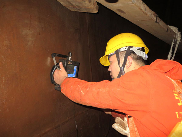 本次氨球检测工作内容包括:球体内上下半球、赤道板、接管、人孔超声波测厚;部分内表面拼接焊缝的磁粉检测;支腿与球体角焊缝100%磁粉检测;部分内表面拼接焊缝的超声波检测;对指定位置丁字口焊缝进行X射线检测。为了节约时间,检测中心每个参战员工发扬特别能吃苦,特别能战斗的“弘旭”精神,以检测小组为单位加班加点穿插进行检测工作,白天进行超声波测厚、焊缝磁粉检测、焊缝超声波检测,晚上利用现场工人下班的空挡时间进行X射线检测。在质量方面,对上一次检测时发现的缺陷进行监测和论证,新发现的缺陷及时向股份公司生产部反映,给股份公司生产部提供第一手监测数据。在施工安全方面,公司领导也十分重视,每一位员工必须按程序进行登记后方可进入氨球进行检测工作,在外面的监护人员定时与球罐内作业人员进行通话,并通知相关部门定时对罐内空气质量进行分析,以确保检测人员安全,在检测工作完成之后,每一位进罐作业人员签字确认后方可离开。在大家的共同努力下,该重点项目共用2天时间分别完成了(T401A/B)两台氨球的各项检测工作,受到股份公司一致好评。(图/文/黄运)